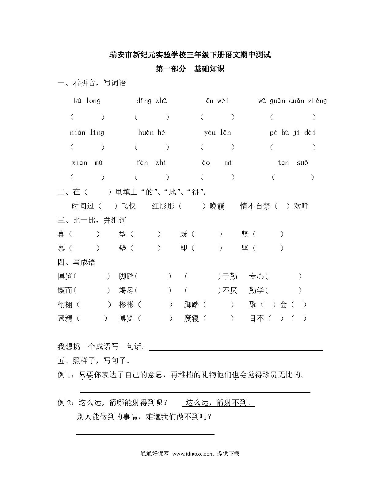 部编版2023年三年级语文下册期中测试卷可下载打印(附答案)