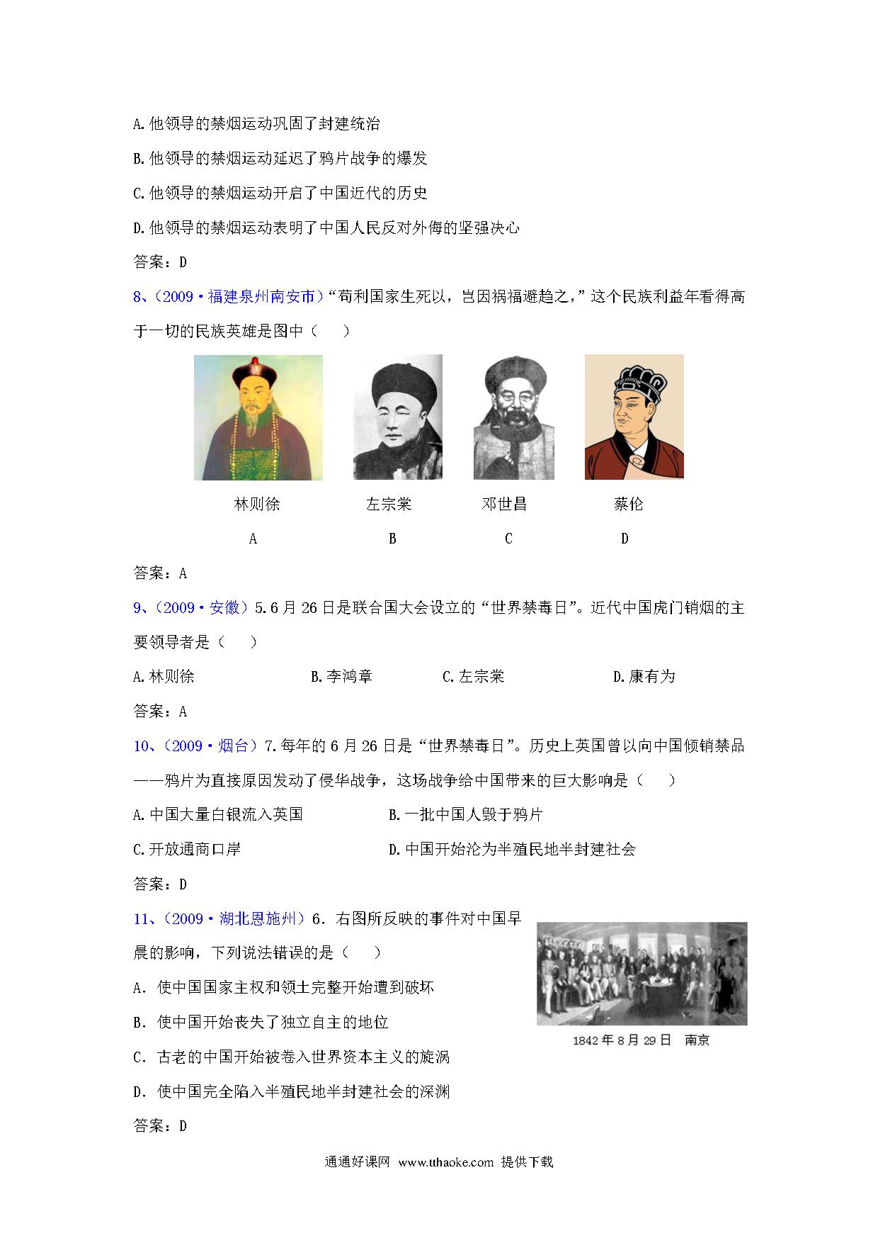 历史中考专项训练:选择题-列强的侵略和中国人民的抗争