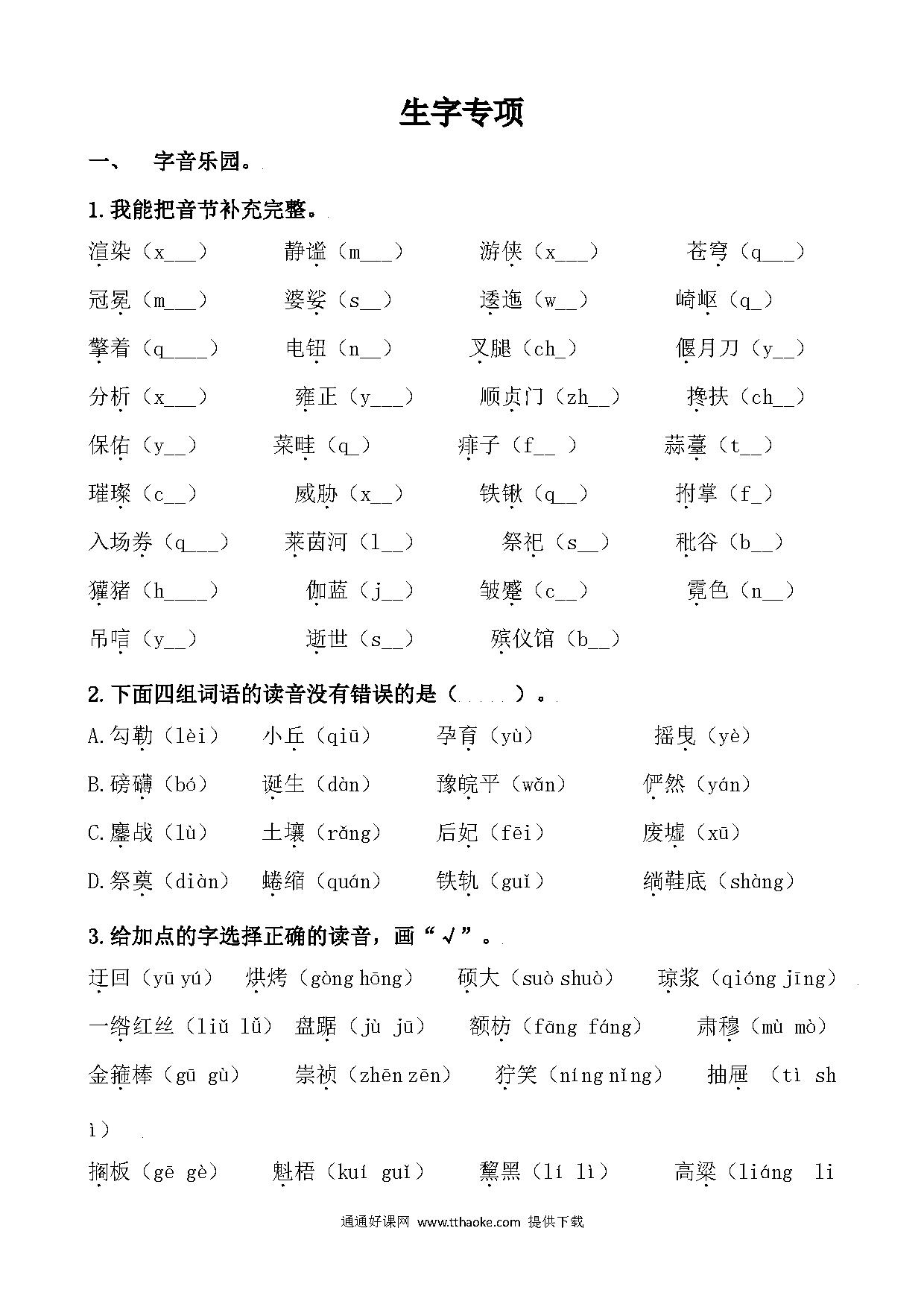 2020-2021学年六年级语文上册生字专项复习题及答案