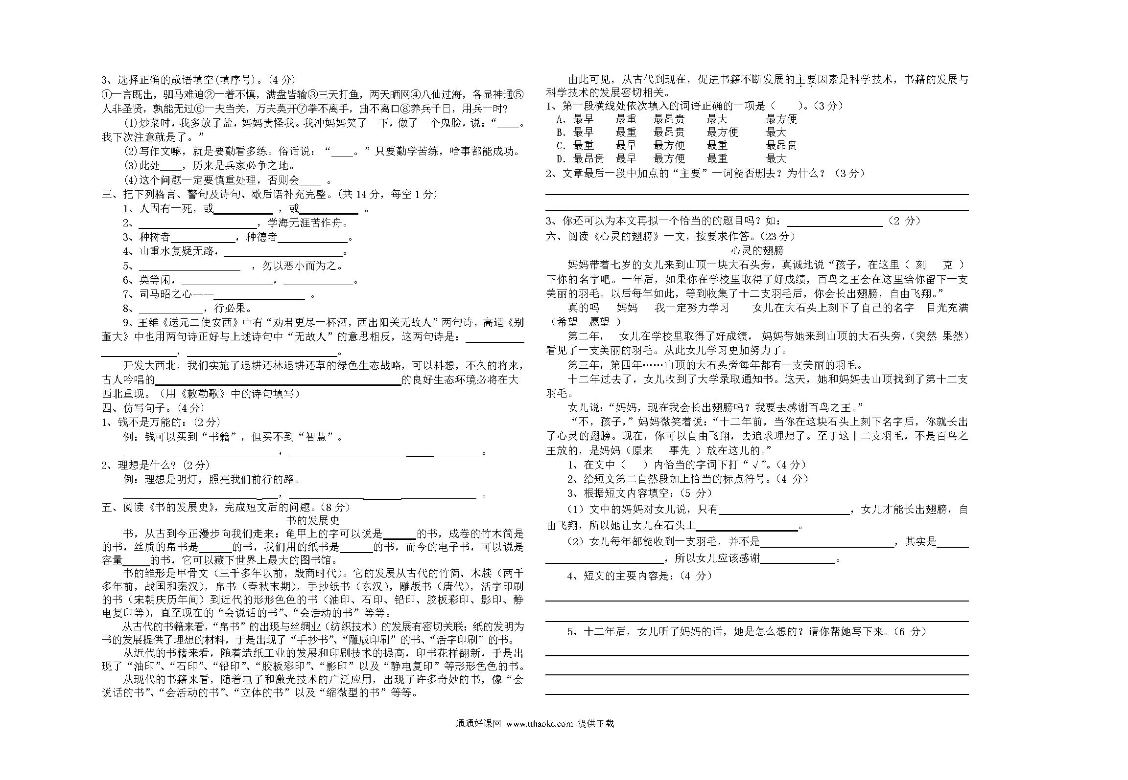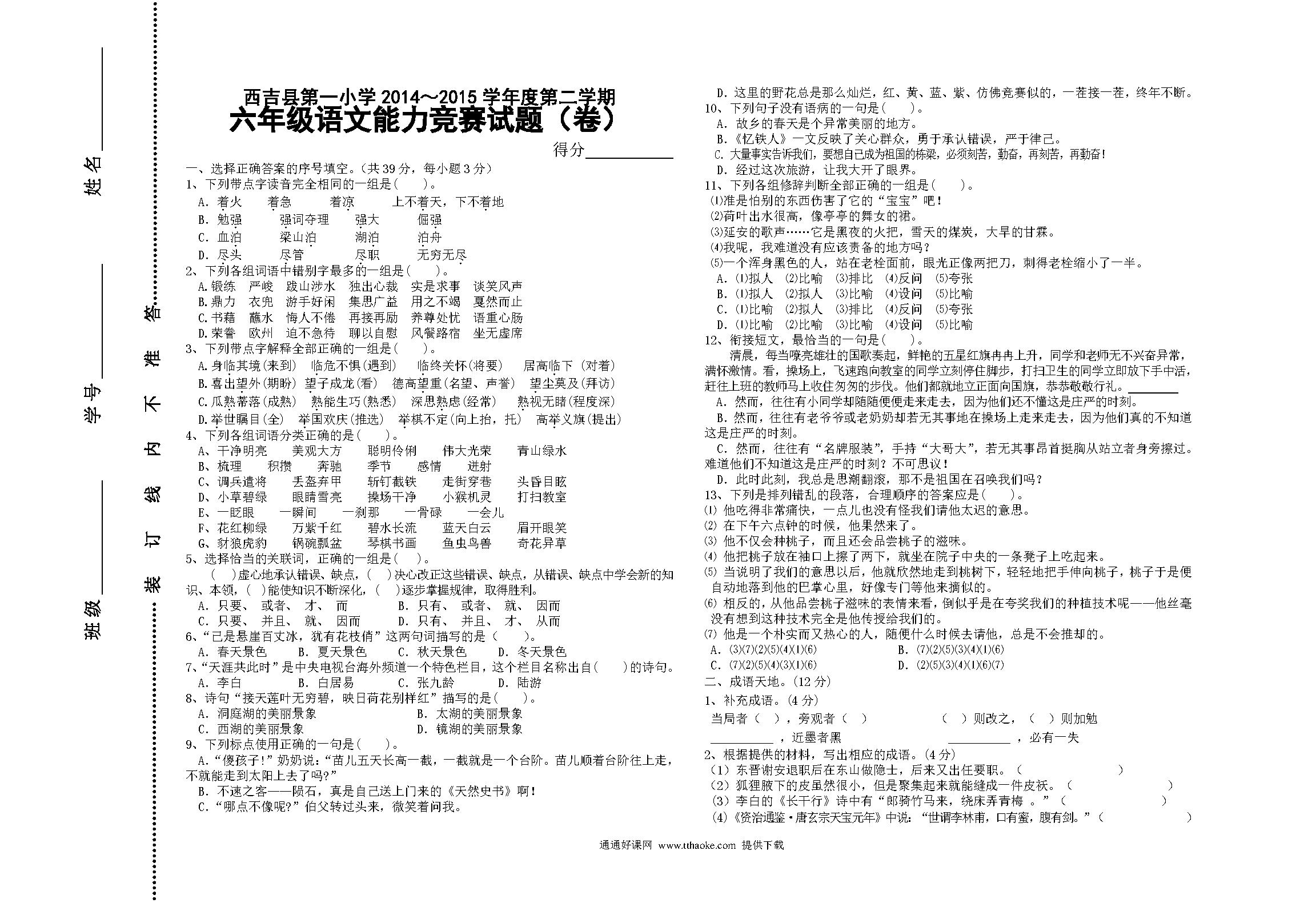 西吉县第一小学第二学期六年级语文竞赛试题(卷).pdf