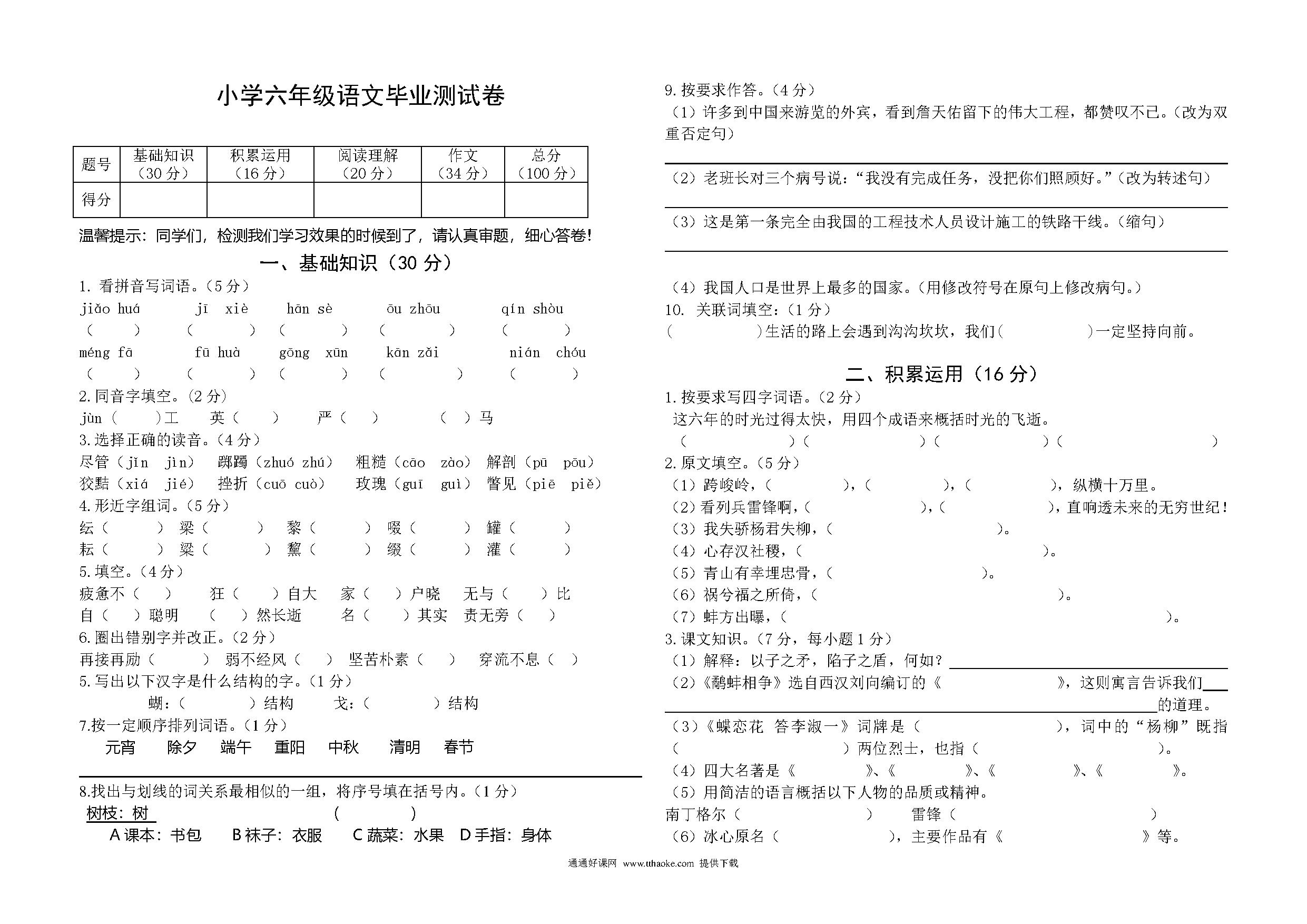 2023-2024部编版六年级语文上册期末综合测试卷免费下载打印(附答案)