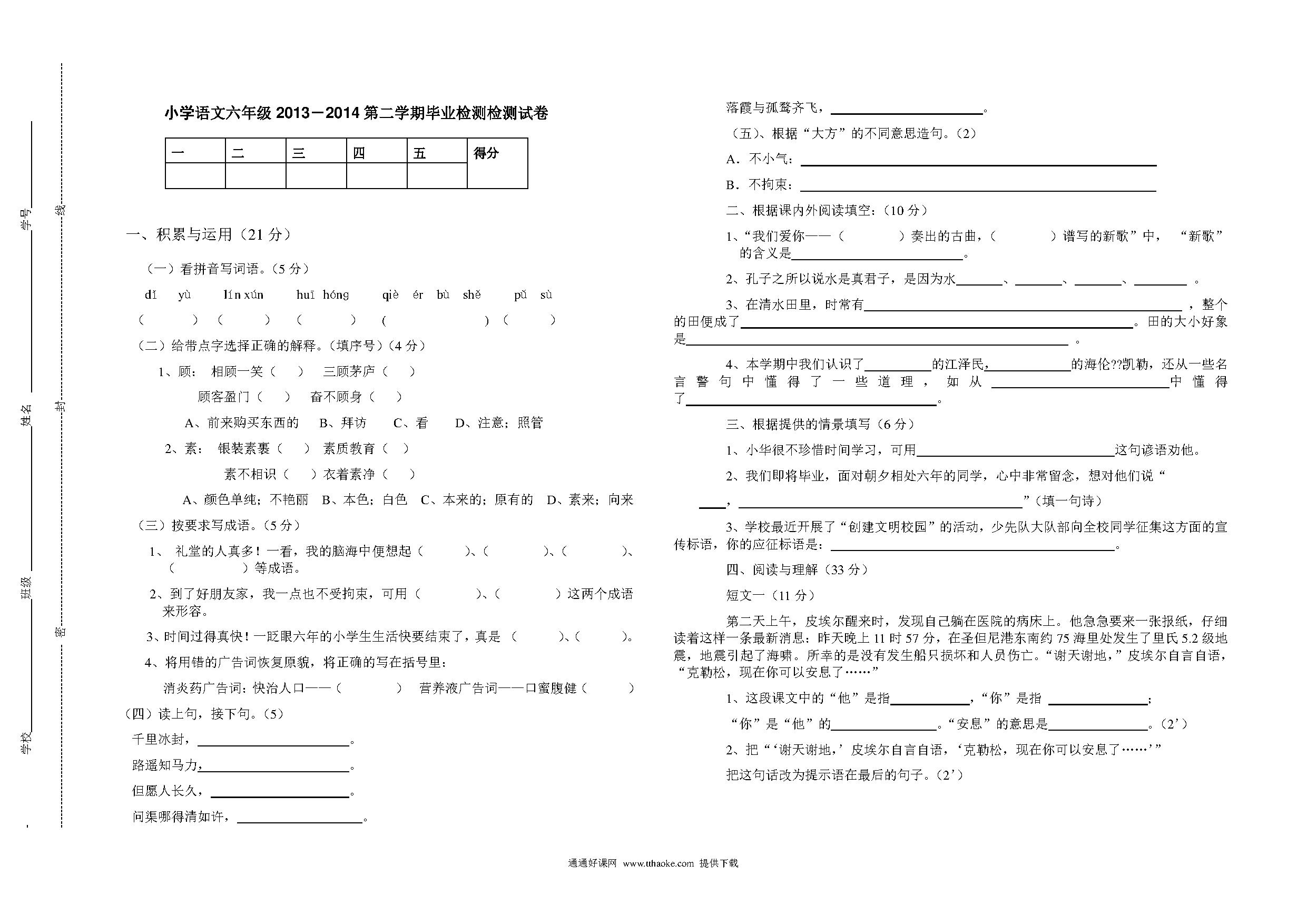 小学语文第二学期六年级毕业检测试卷