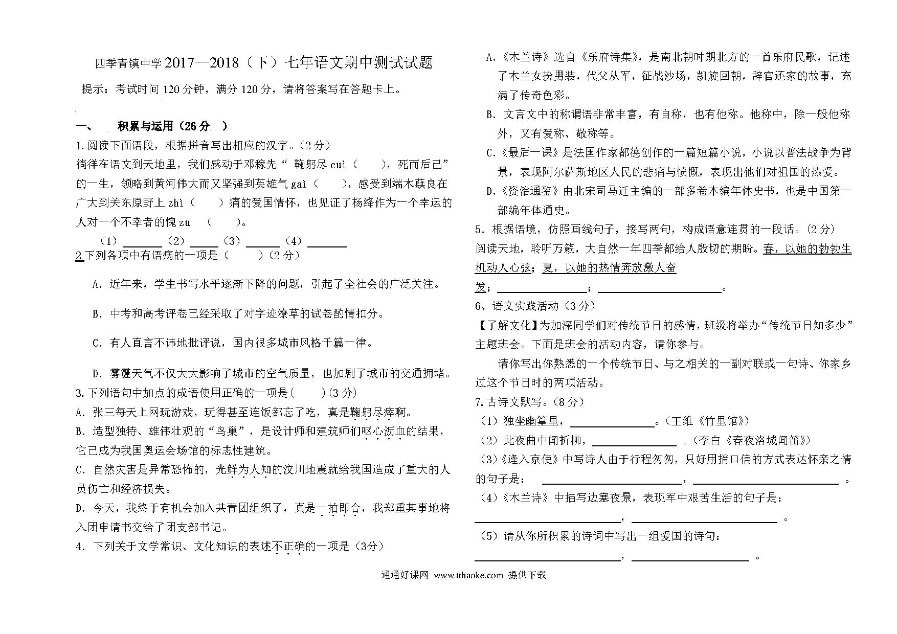 七年级语文下册期中试卷