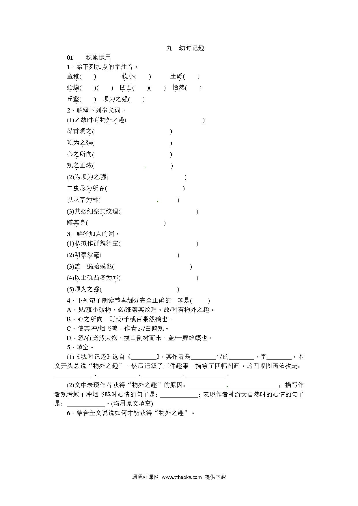 2016年9.幼时记趣练习题及答案.pdf