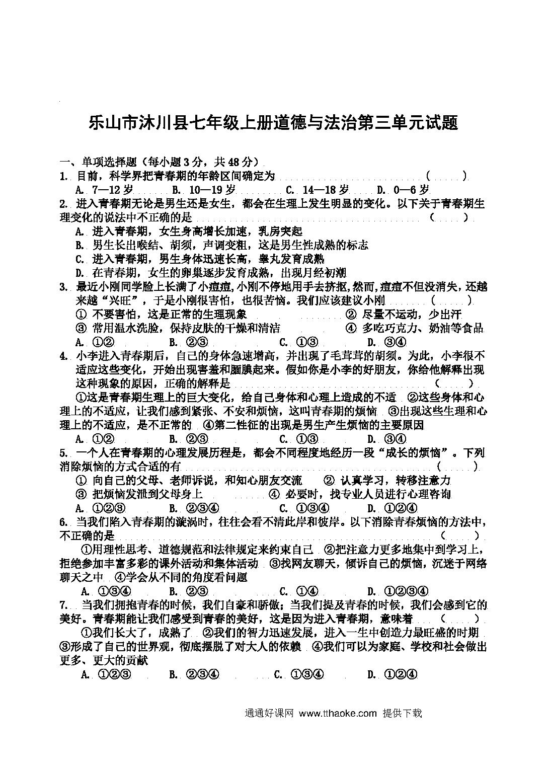 教科版七年级道德与法治上册第三单元成长中的我测试题及答案.pdf