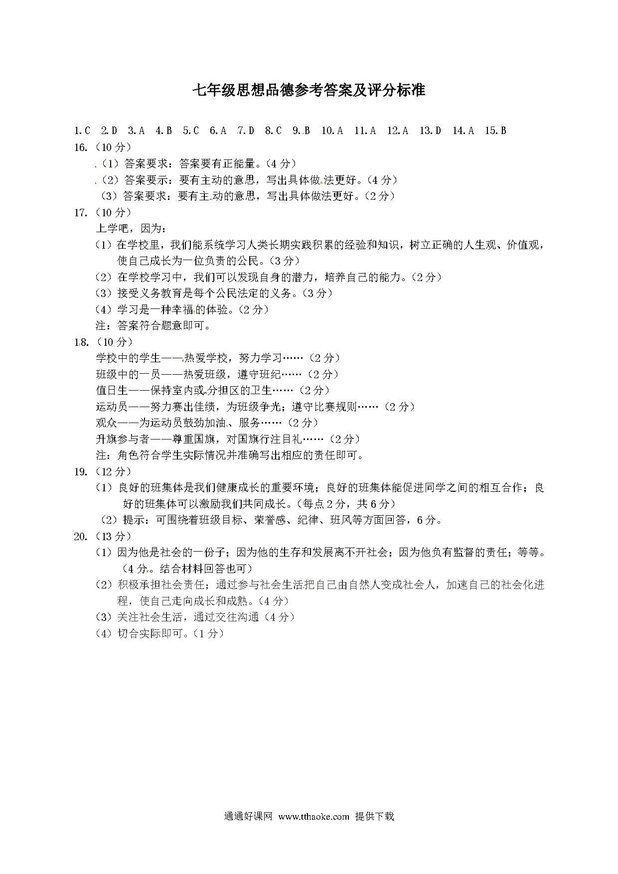 长春汽车开发区第一学期七年级政治期中试卷及答案