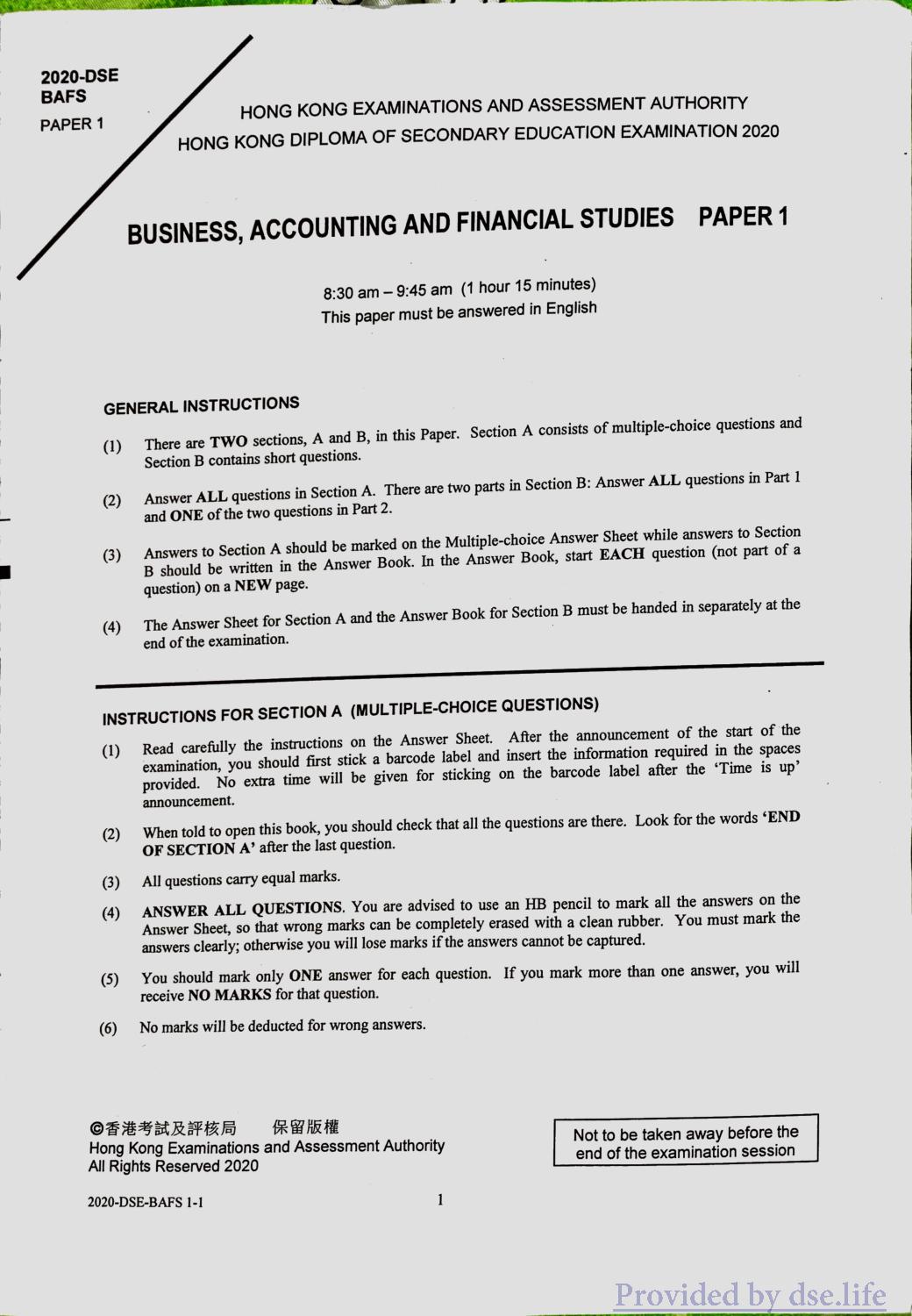 企业、会计与财务概论 DSE(英) 2020