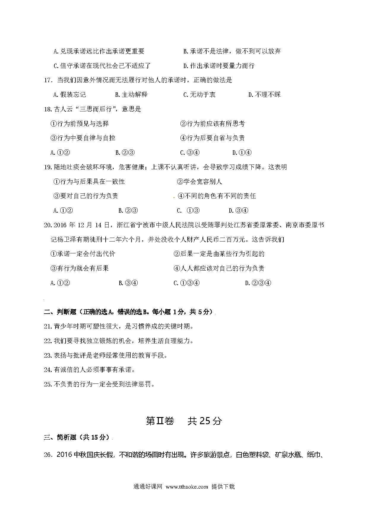 山东省蒙阴县上学期八年级道德与法制期中试卷