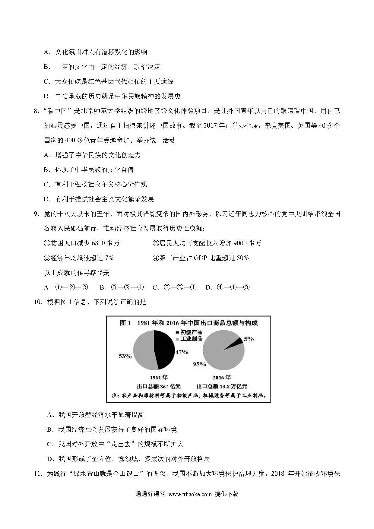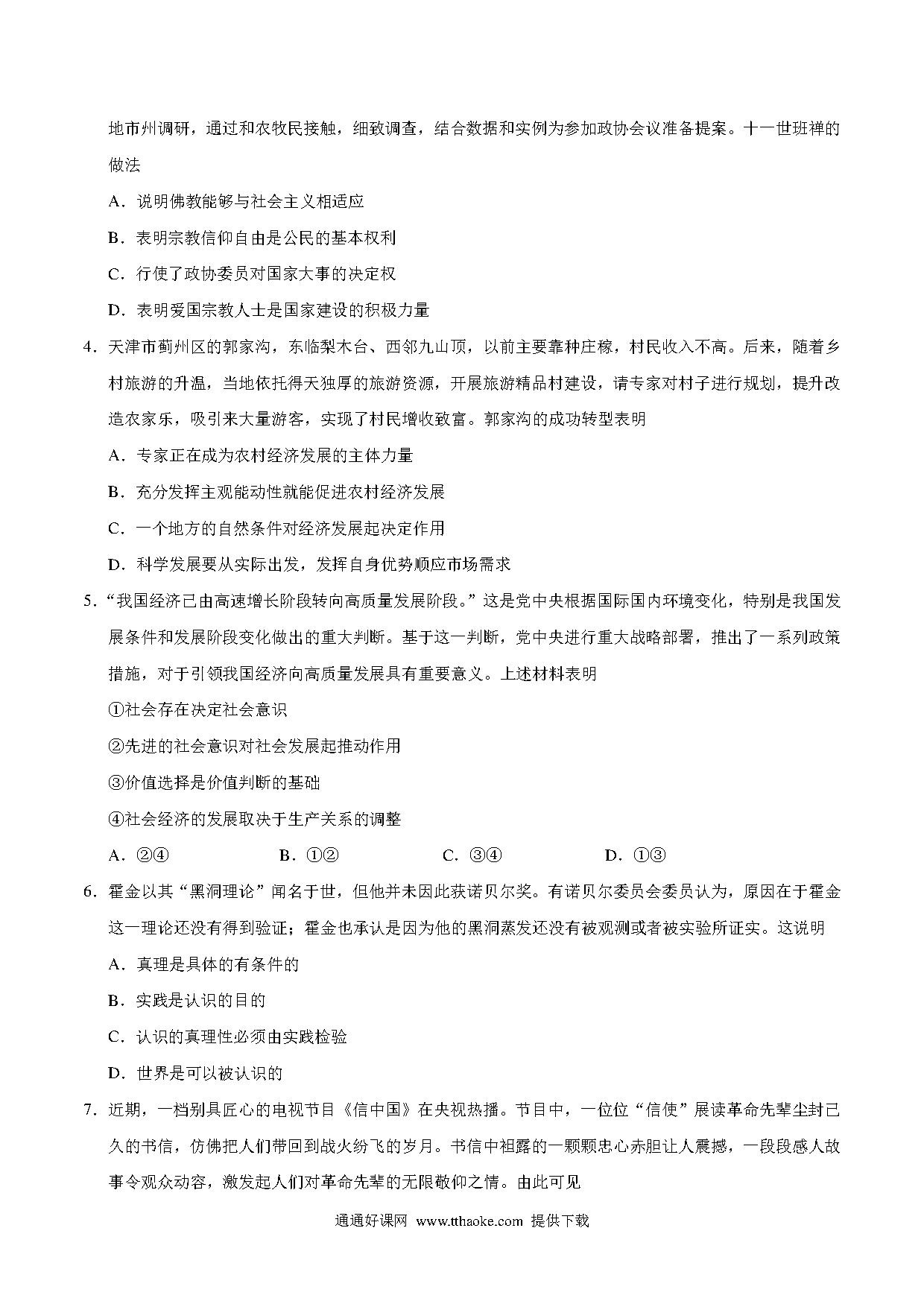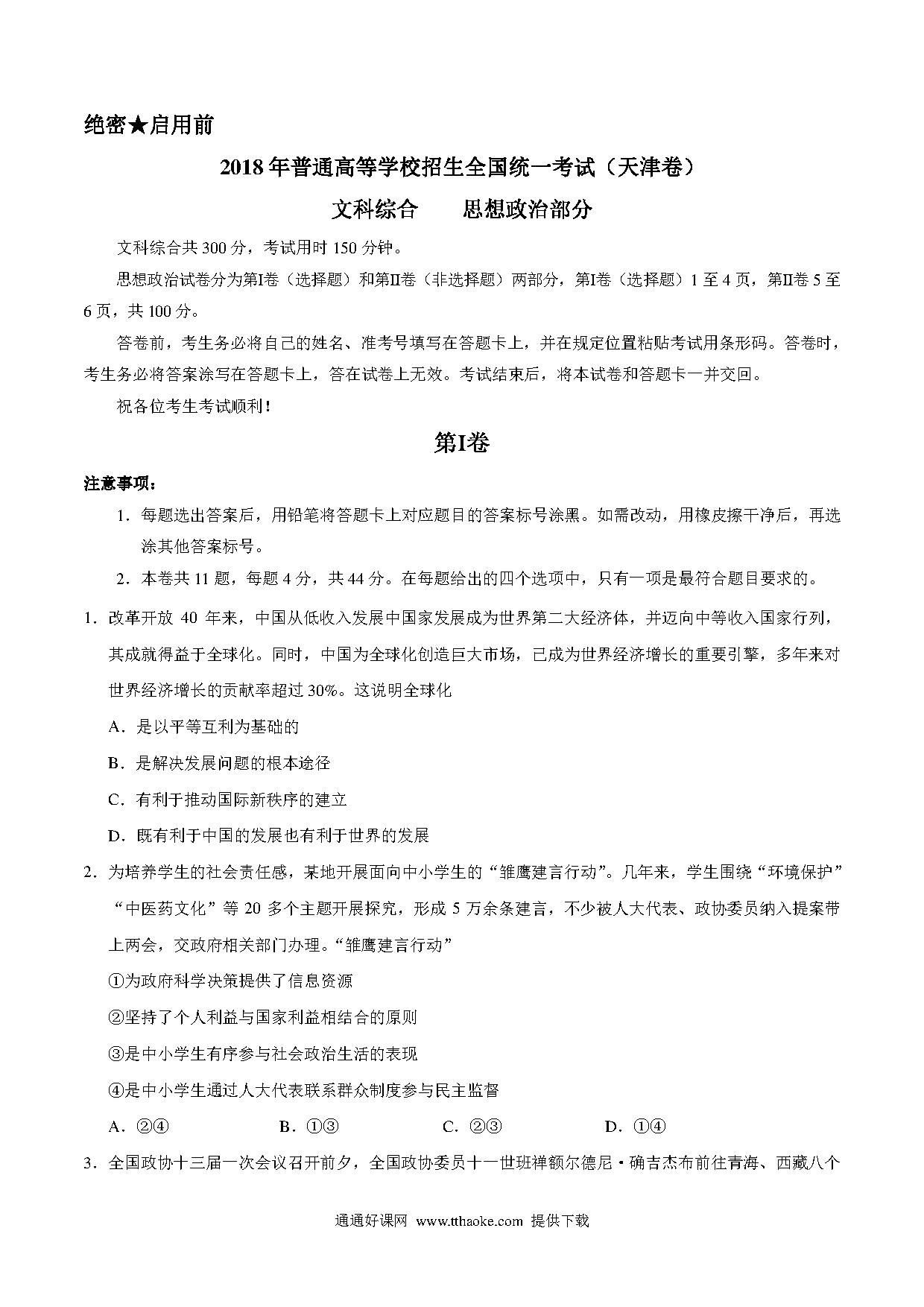 2018年高考试题(天津卷)文综政治(word答案).pdf