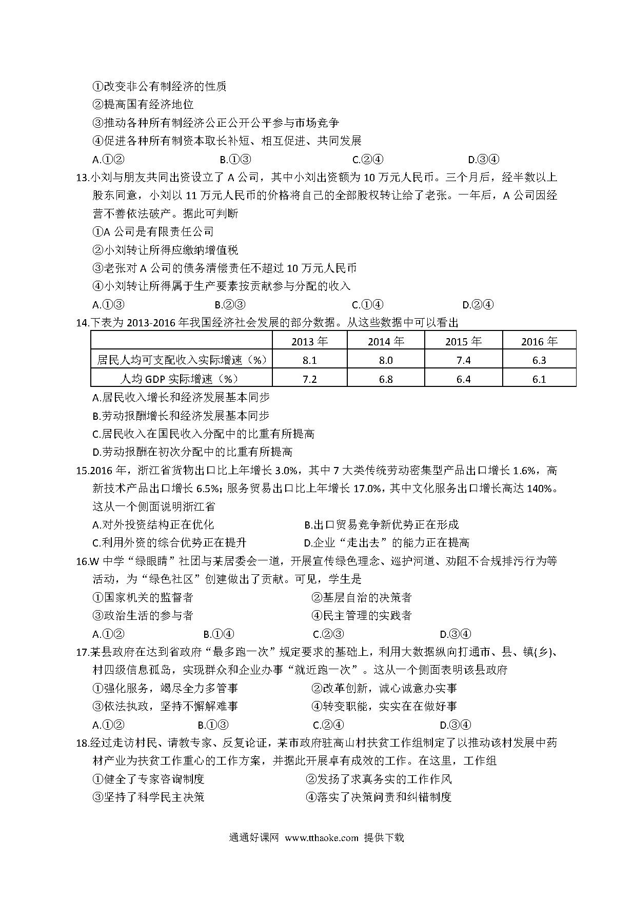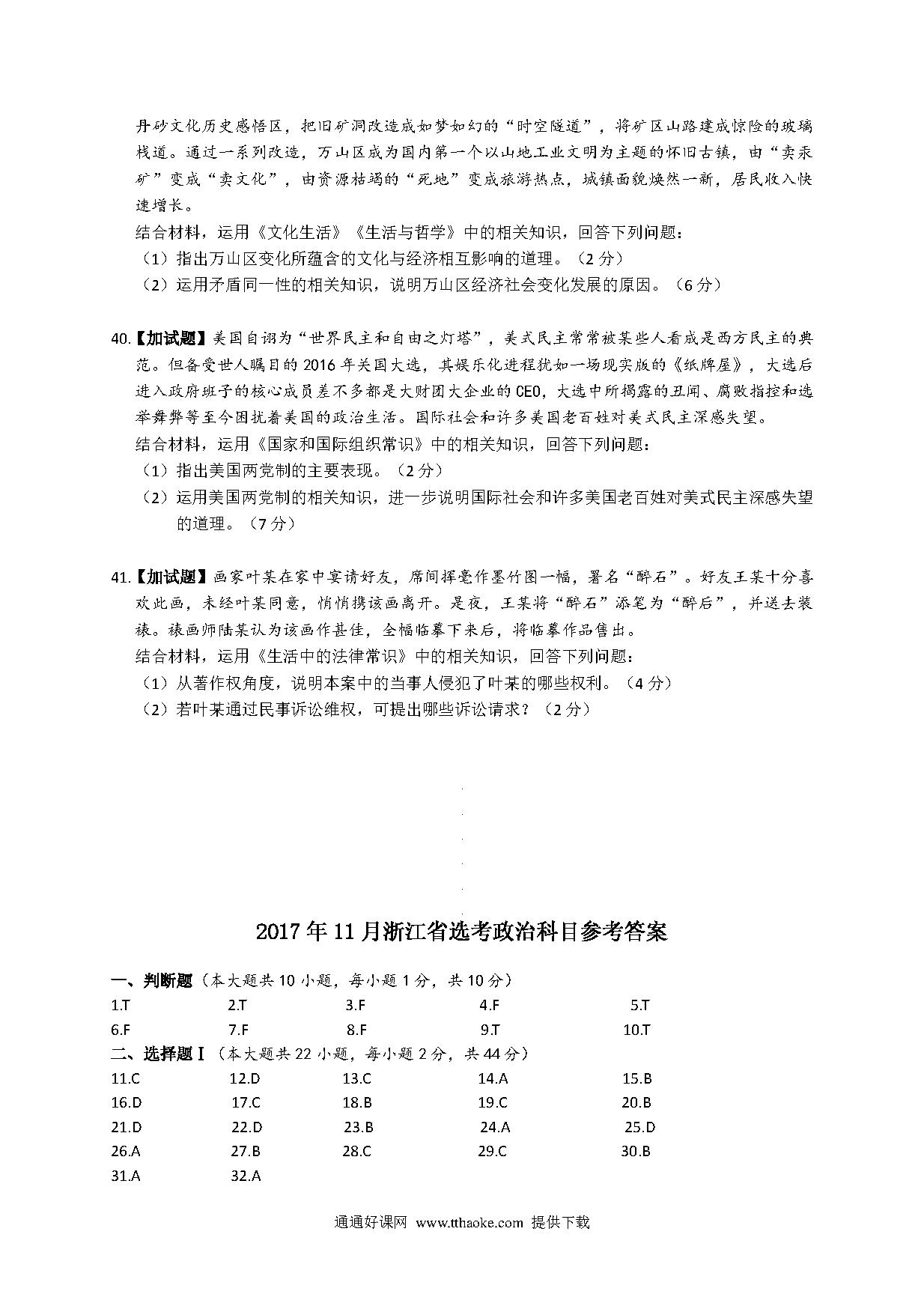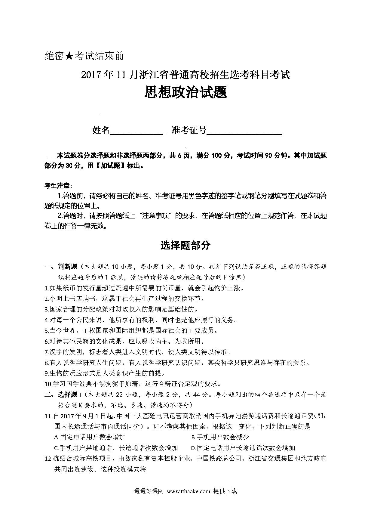 2017年11月浙江省选考政治试卷(含答案).pdf