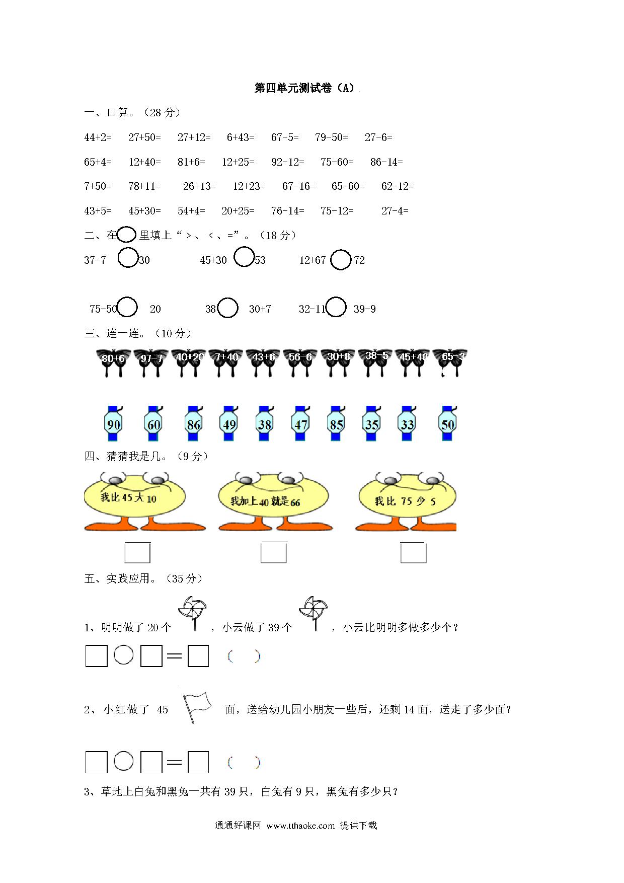 人教版一年级数学上学期期中竞赛试卷免费下载打印(附答案)