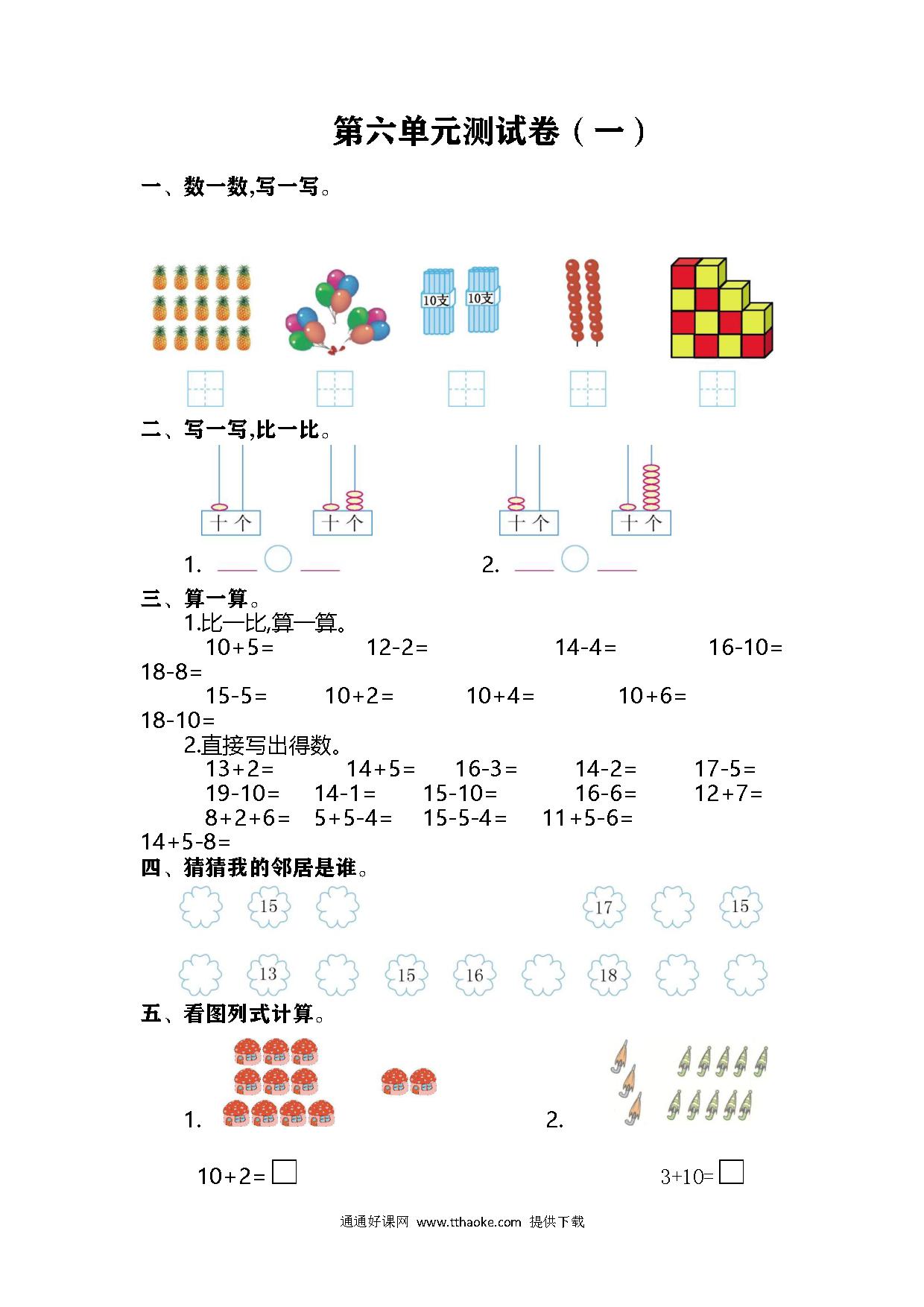 2019-2020学年第一学期人教版一年级数学第六单元测试题及答案(一