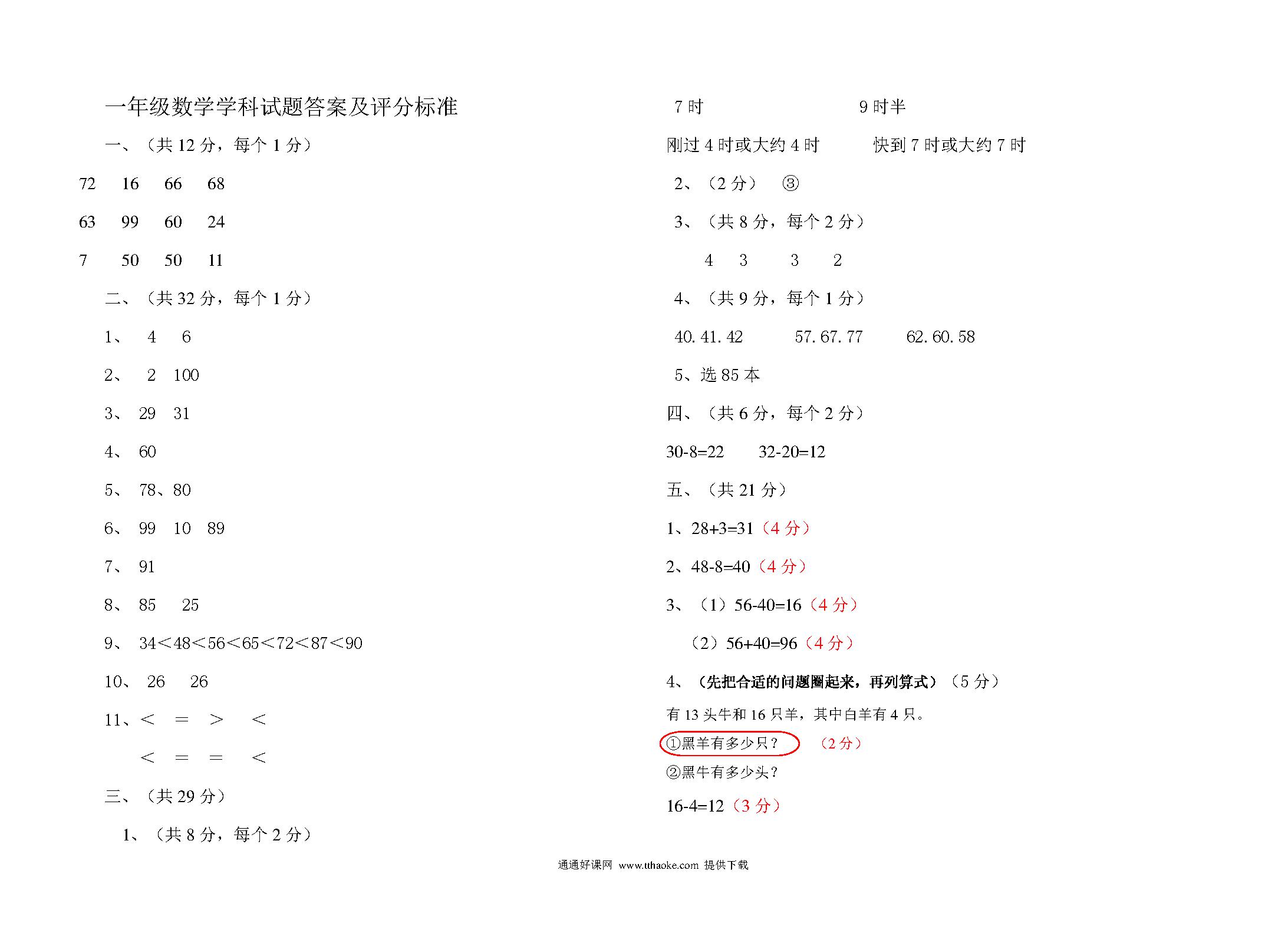 人教版一年级数学上学期期中竞赛试卷免费下载打印(附答案)
